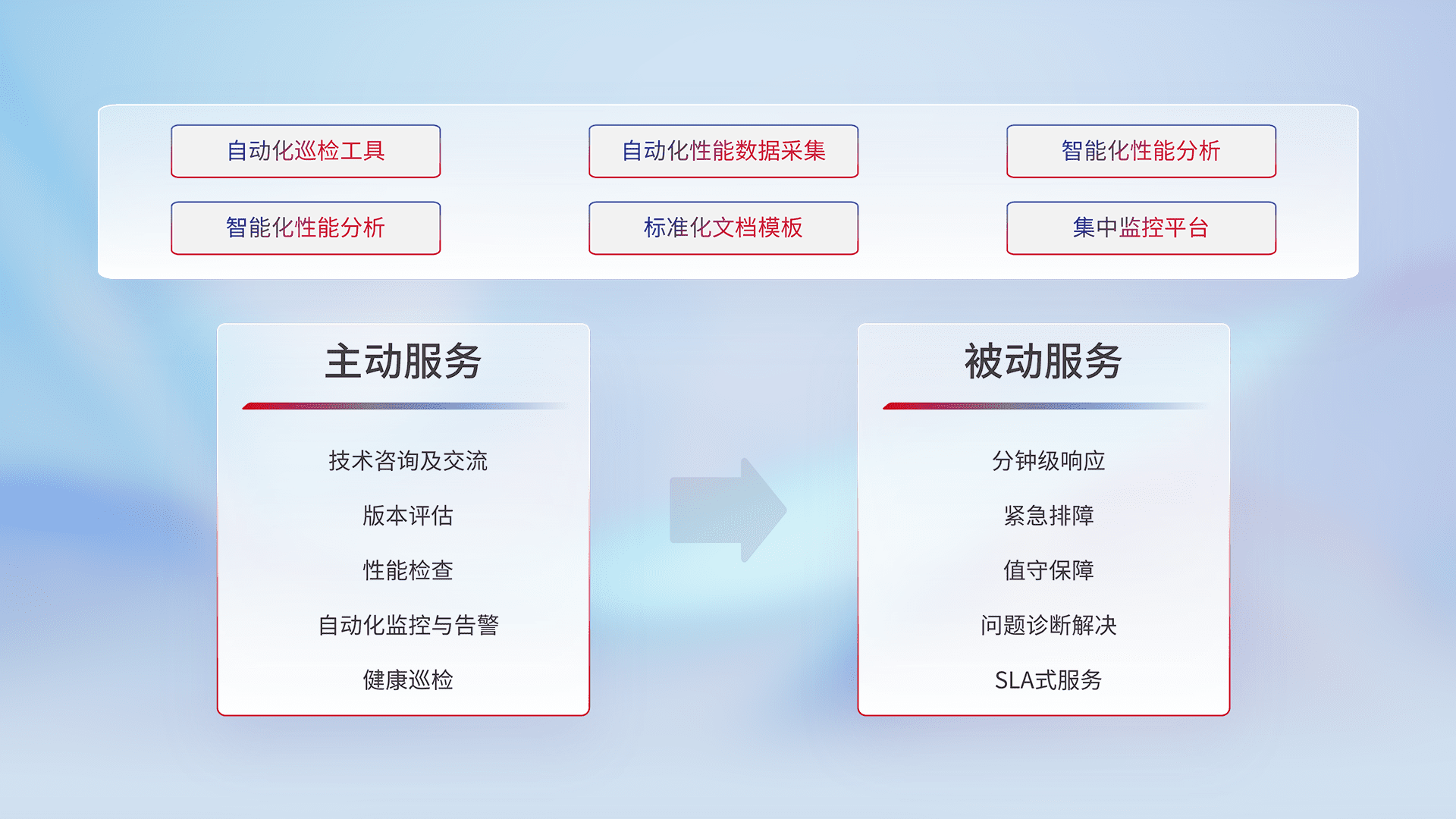 智能化工具和标准化文档,,,保障服务质量,,,,提供主动服务(包含技术咨询、、版本评估、、、、性能检查、、、、自动化监控与告警、、健康巡检)和被动服务包含(分钟级响应、、、紧急排障、、、值守保障、、问题诊断解决、、、SLA服务)。。。。