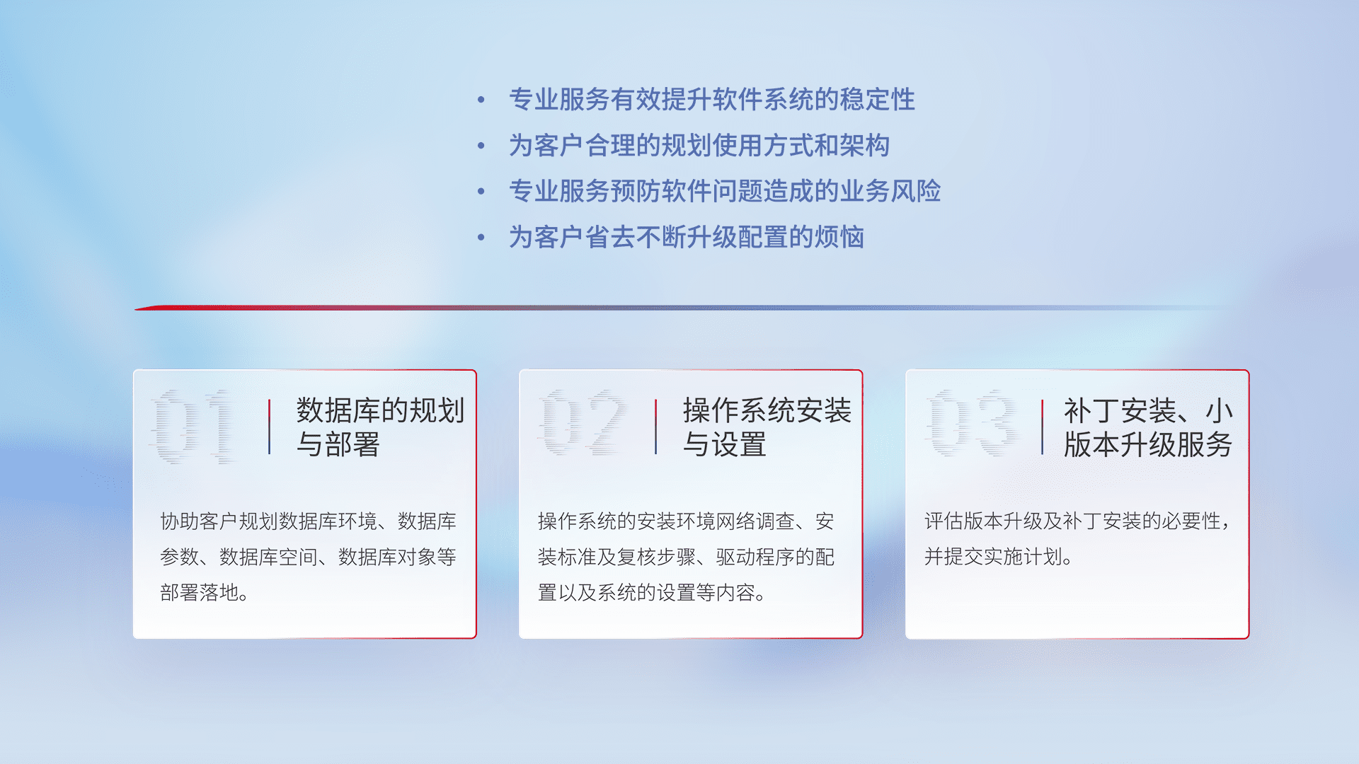 为客户提供软件规模升级、、、快速部署、、、按需配置的专业服务,,,,从数据库的规划与部署到操作系统的安装与设置,,,再到补丁安装和小版本升级提供支持。。